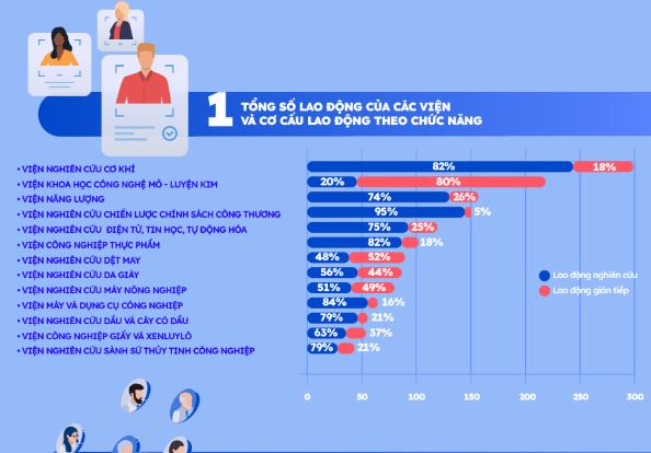 Tổng số lao động của các viện thuộc Bộ Công Thương và cơ cấu lao động theo chức năng. (Nguồn: Vụ Khoa học và Công nghệ).